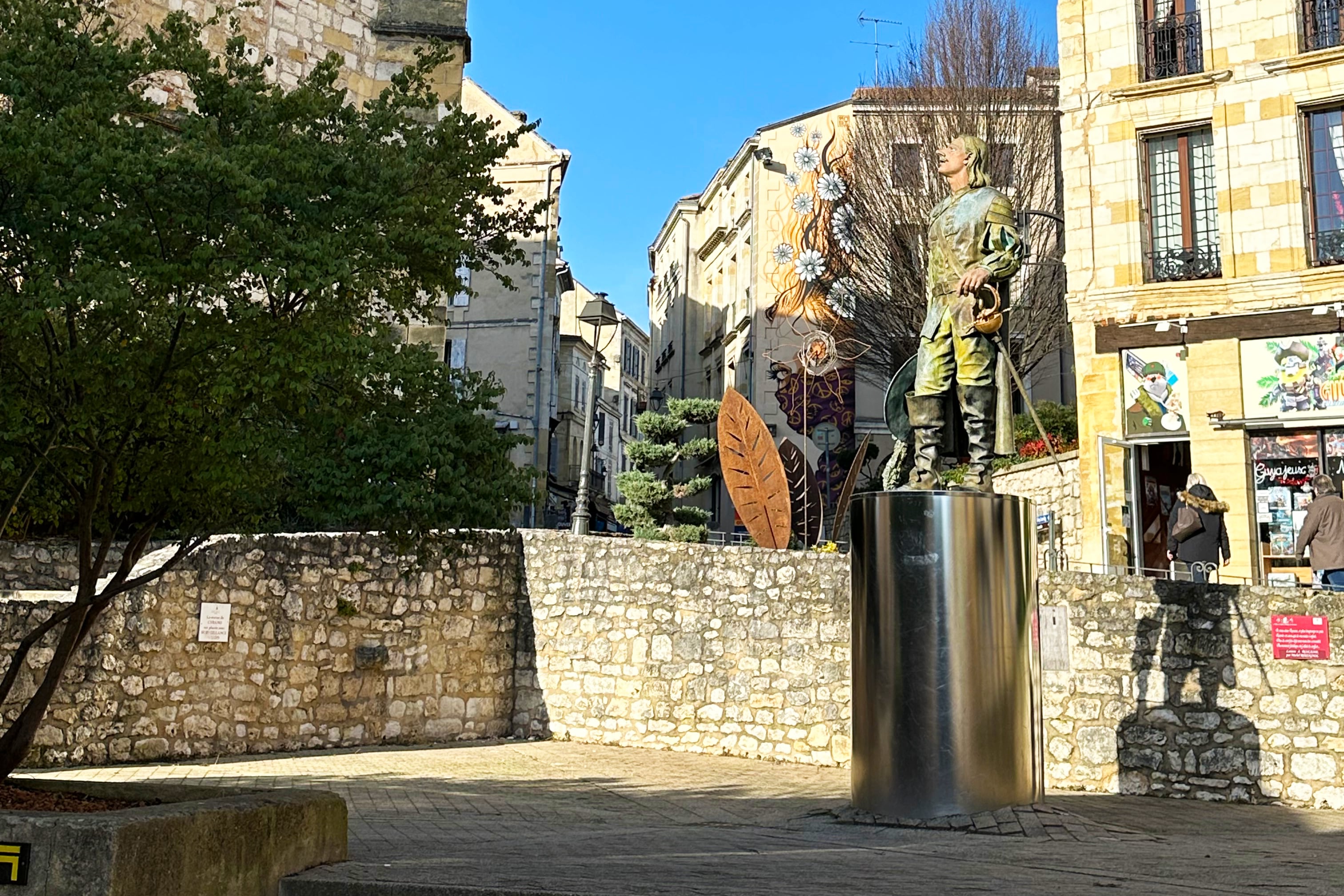 ベルジュラックの旧市街地は木組みと煉瓦の中世の街並みが美しく、観光の名所には戯曲や映画で有名なシラノ・ド・ベルジュラックの像があります。